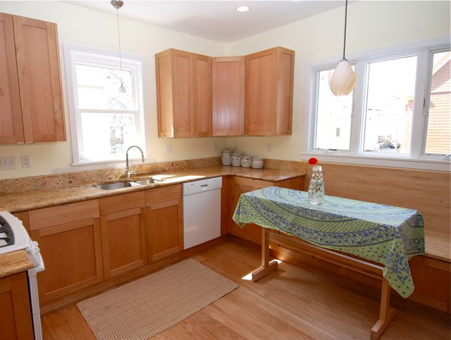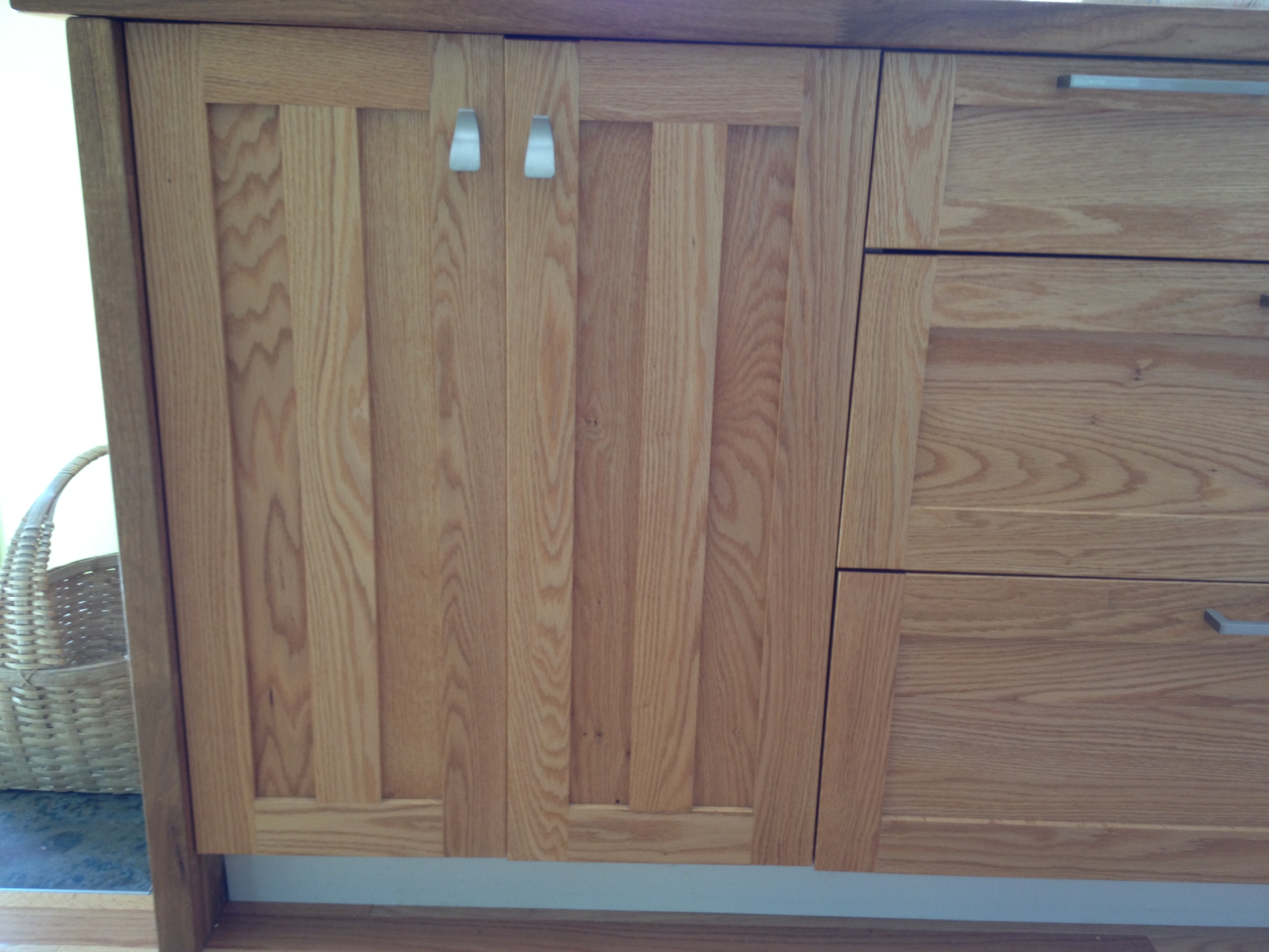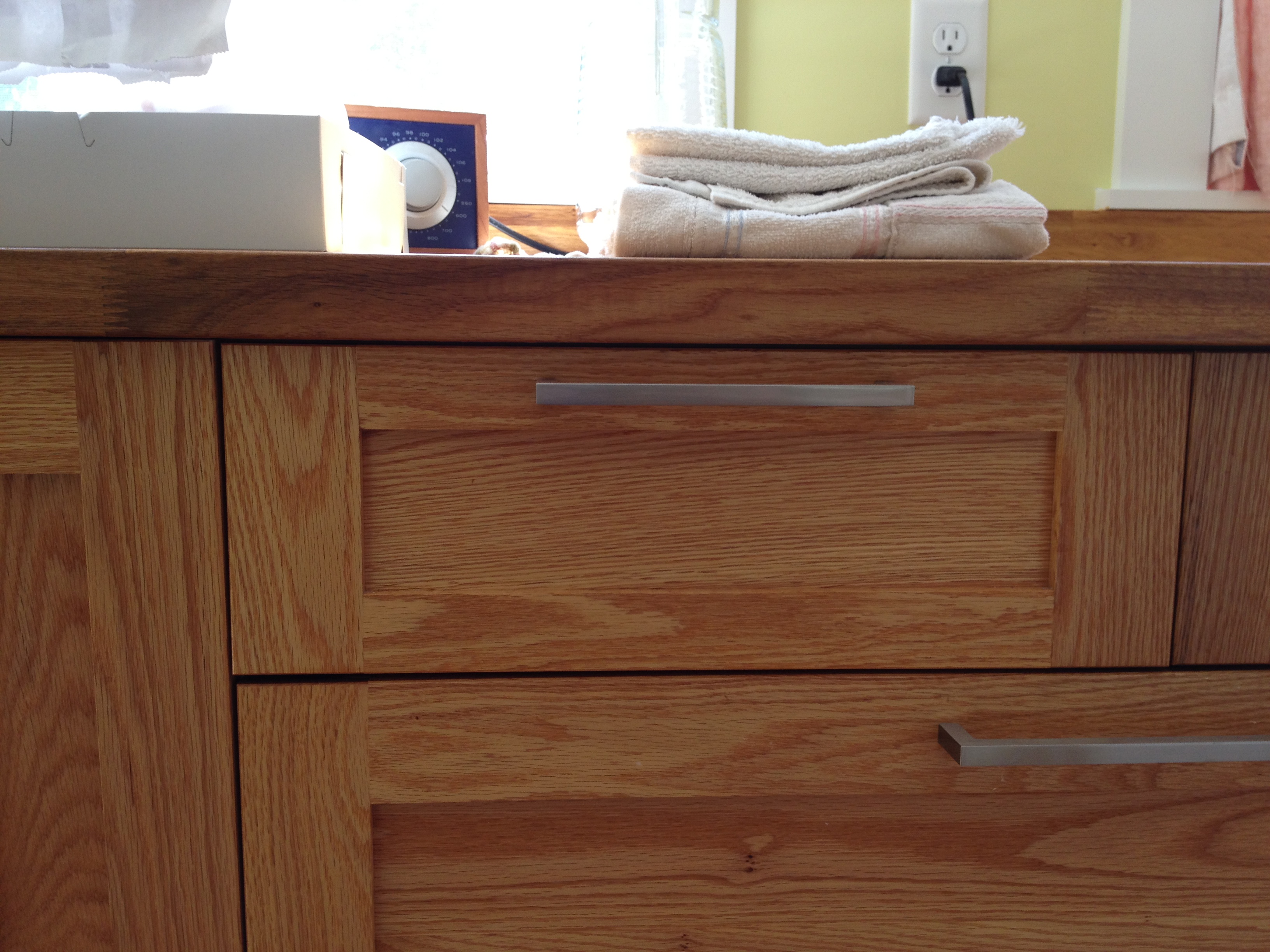 - The drawback to the IKEA products is that they have a limited number of sizes and sizes (compared to, say, the Kraftmaid line at Home Depot). It would have been nice if IKEA has some 6” base cabinets, or some end cabinets that were not open. We worked around these things. In one case, I bought two 6” base cabinets from Miller’s Pride (available special order from Home Depot), had my carpenter, John, make some adjustments (they were 1/4” shorter than the IKEA) and then I got Scherrs doors made for these. He just drilled the holes for the hinges in the cabinet where they needed to be and that worked.