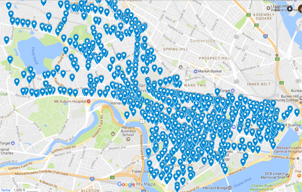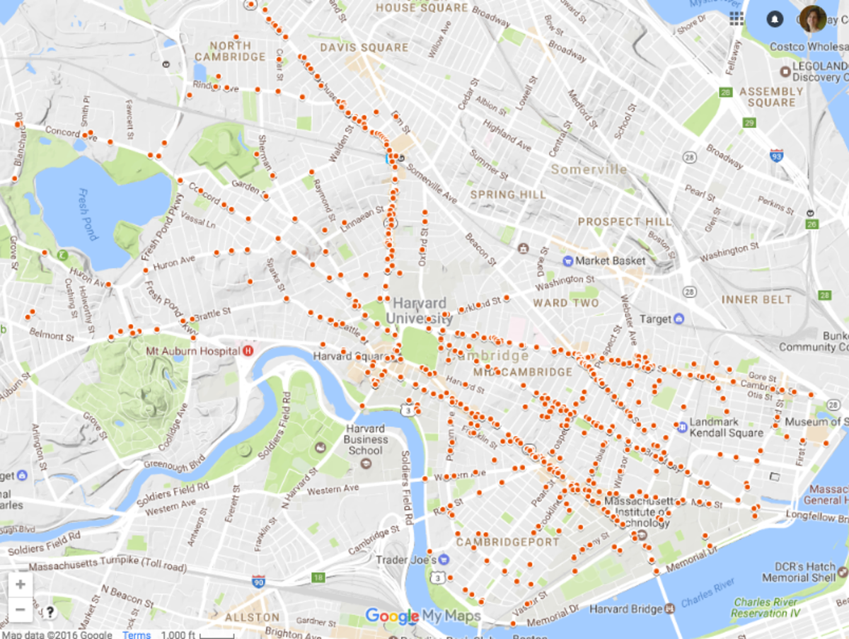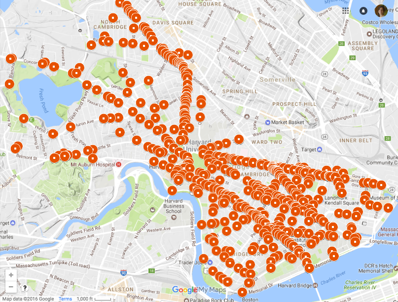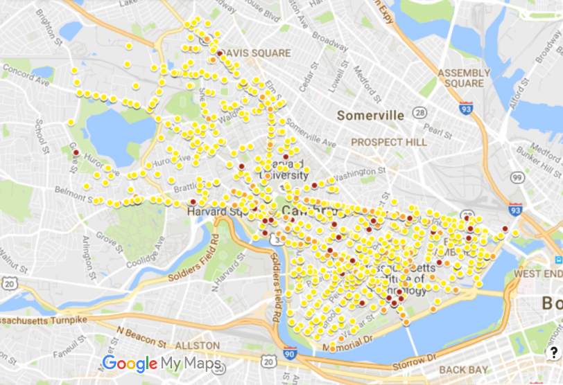 Cambridge, which is at the forefront of Open Data, has made accident data (involving motor vehicles, bicycles, and/or pedestrians) available through its Open Data Portal. I thought I’d have a look at what I could learn by visualizing this data using Google’s “My Maps,” first with the 2014 accident data and then with a larger data set that I found on the open data portal.