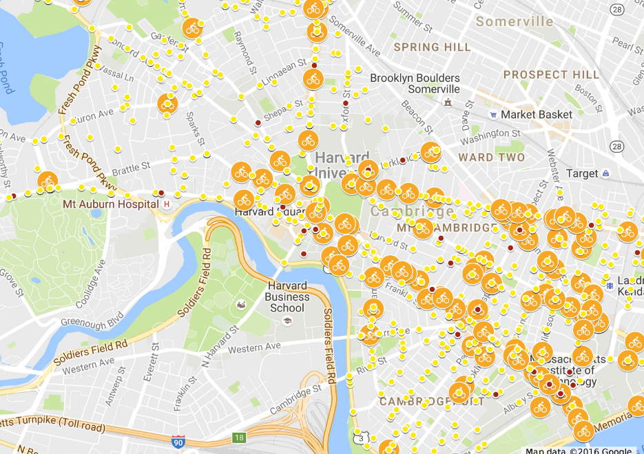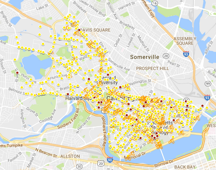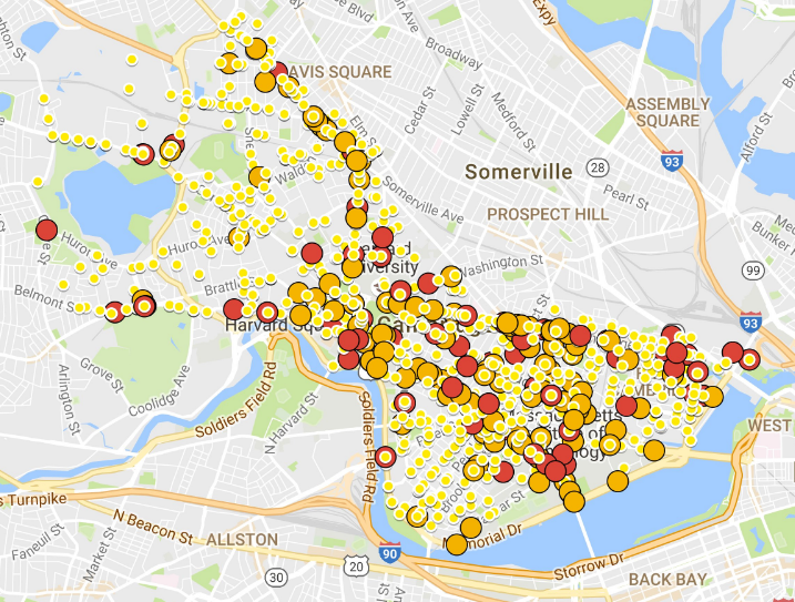 In October, a Lexington cyclist was killed by an 18-wheeler in Porter Square. In June, another cyclist was killed in a collision with a landscaping truck in Inman Square. This follows a fatal crash last year in Cambridgeport. After a cyclist was killed by a truck at BU in 2014, the Boston Area Research Initiative release a bicycle crash map.