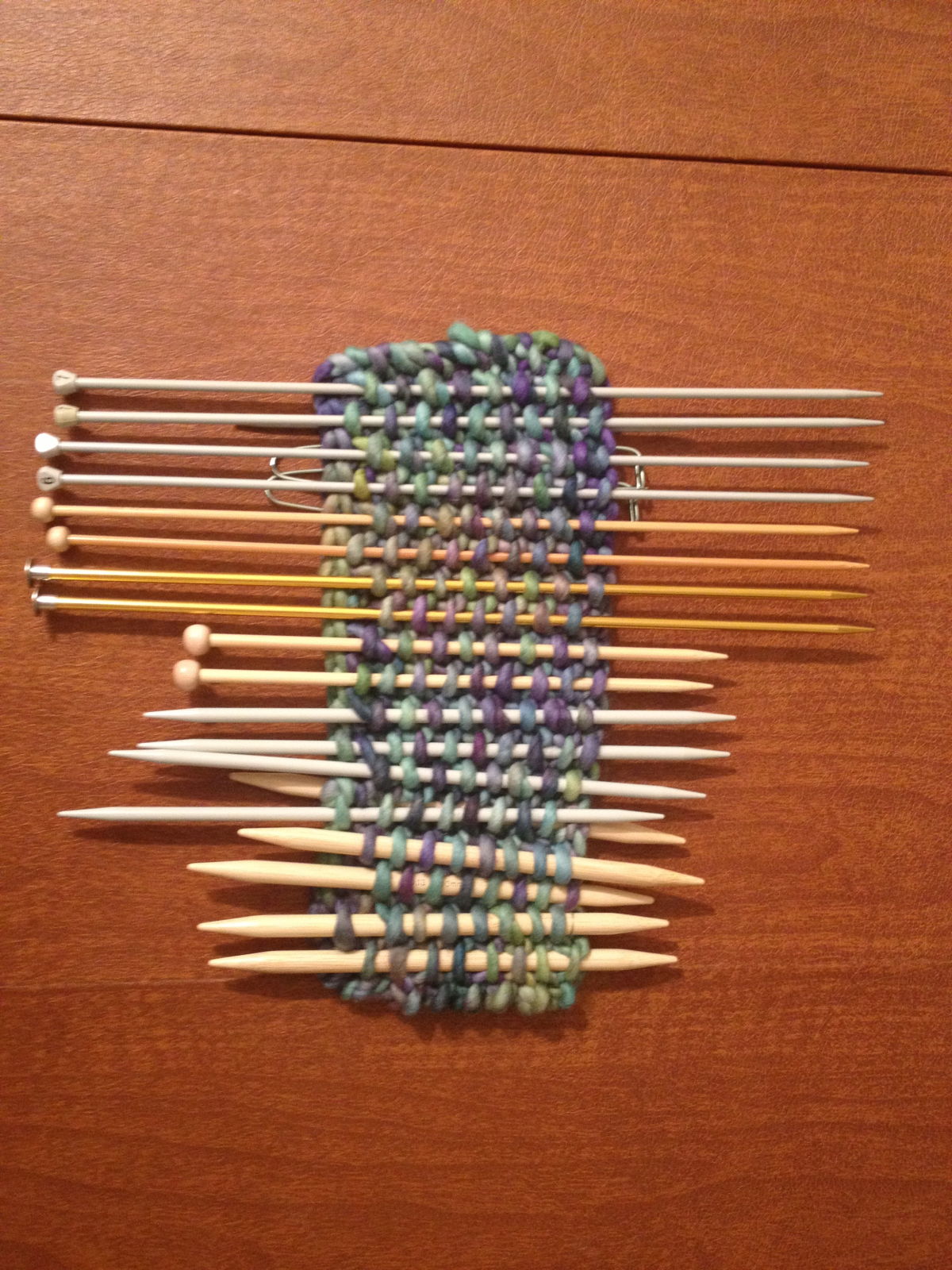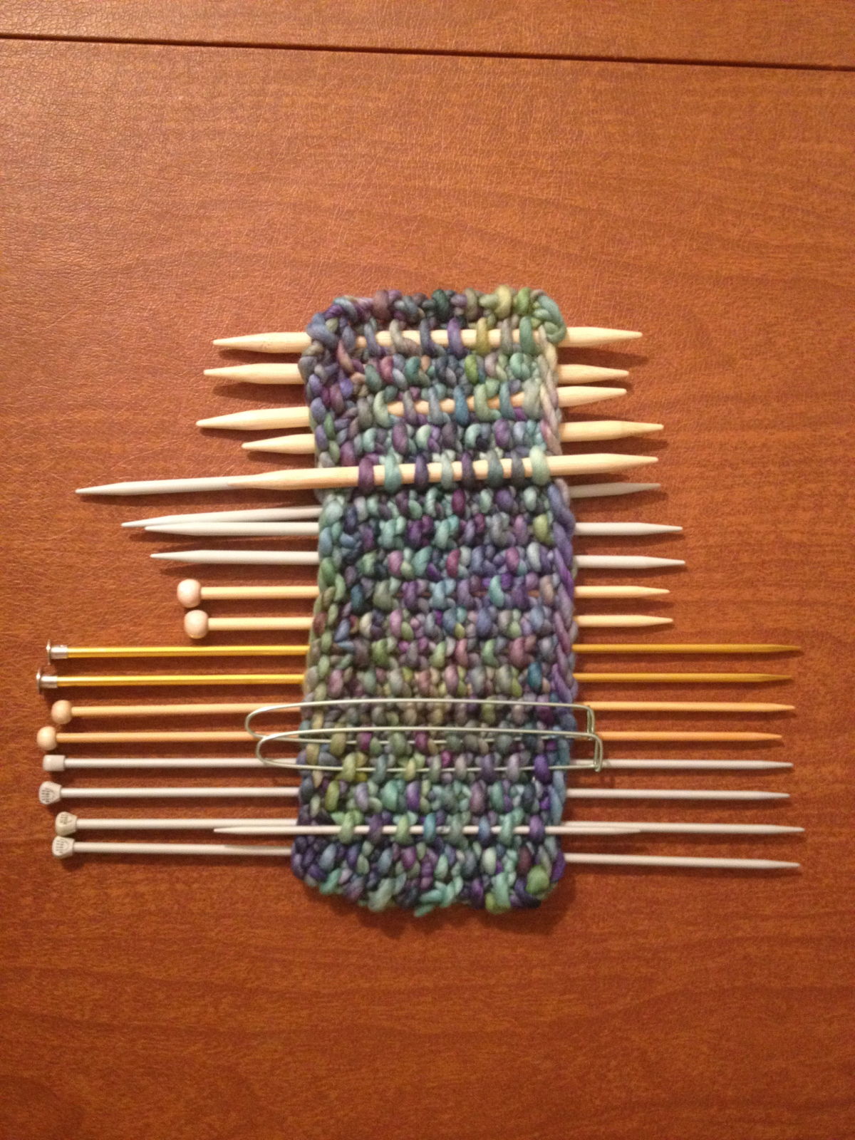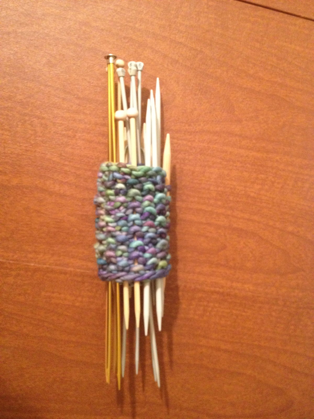 Here are a lot of nice sewn holders for knitting needles out there, but I wasn’t up for another sewing project, so concocted this little holder out of some left-over Malabrigo Rasta that I had on hand.