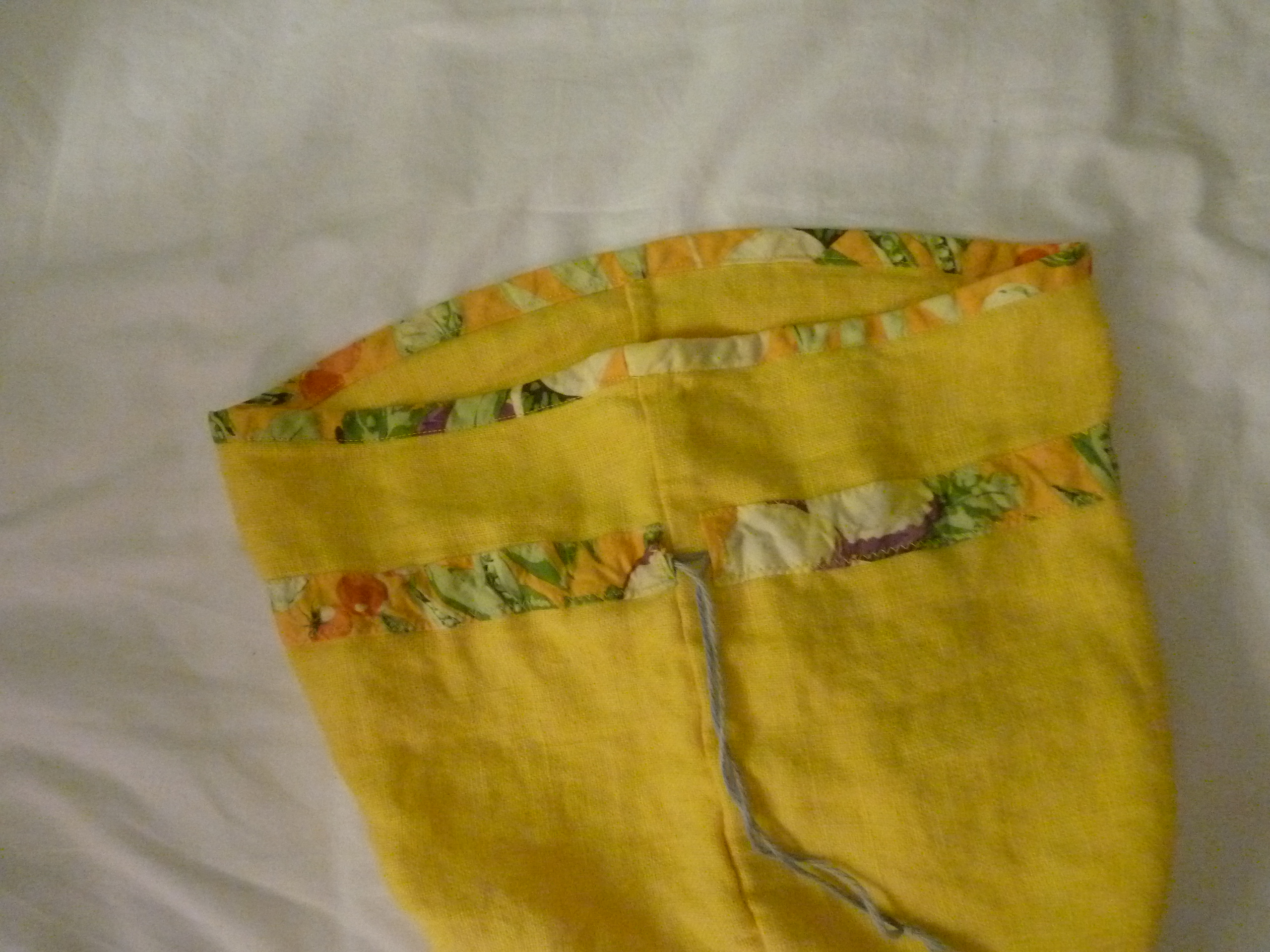 - Finish off the top (narrow) edge with bias strips made of 2” bias-cut light weight cotton. Press the strip first, then sew one edge to the top of the linen bag. Turn over and stitch again from the outside at seam, being sure to catch the underneath edge. Makes a very clean, pretty finish.