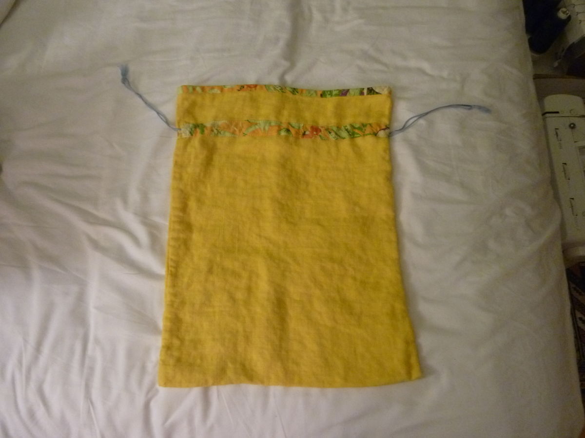 We’ve been running out of plastic grocery bags for trash and storing of food, so I googled a bit to see if cloth bags might work for bread. The consensus I found was that linen might work well so Mohan and I sewed up this linen bread bag from a medium-heavy weight linen sample I had on hand accented by a bias strip of a lovely vegetable print that I also had on hand. We used two lengths of cotton thread for the double draw string. Will report back on how it does on the bread — if it doesn’t work, it will be useful in other contexts. Details below: