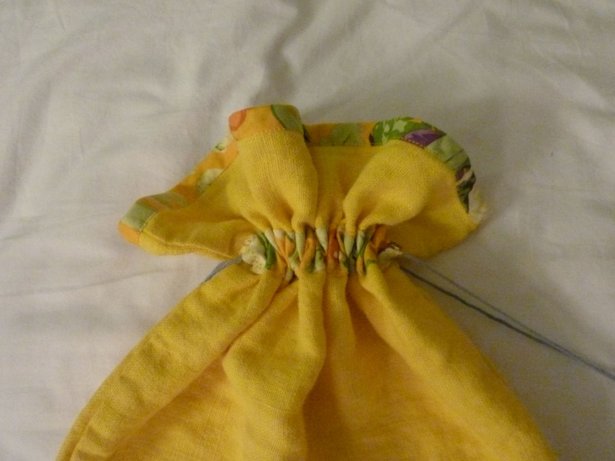 - Make draw strings (two, coming from either side) of 3′ length of cotton yarn, ribbon, other. Tie each of the ends together.