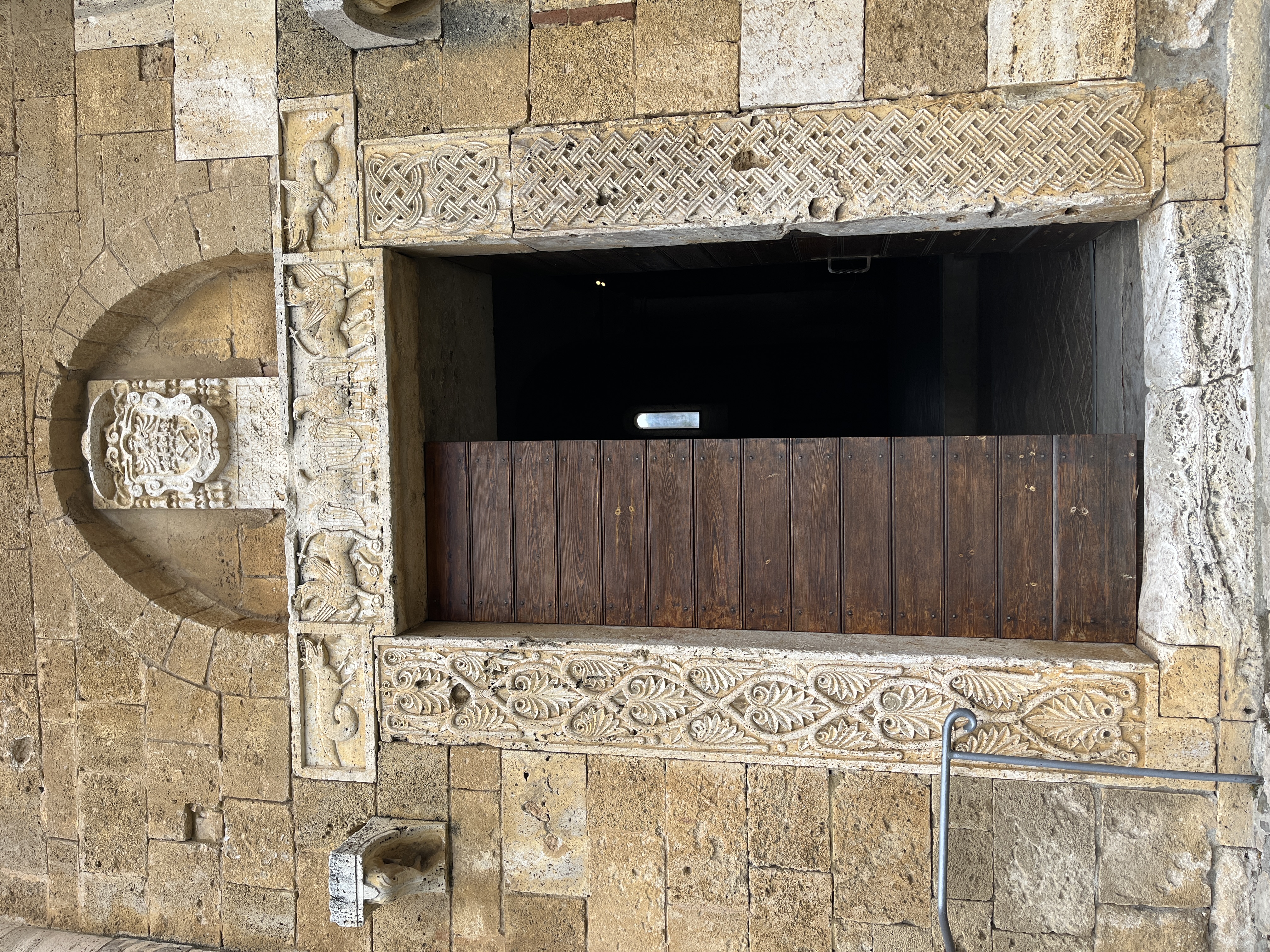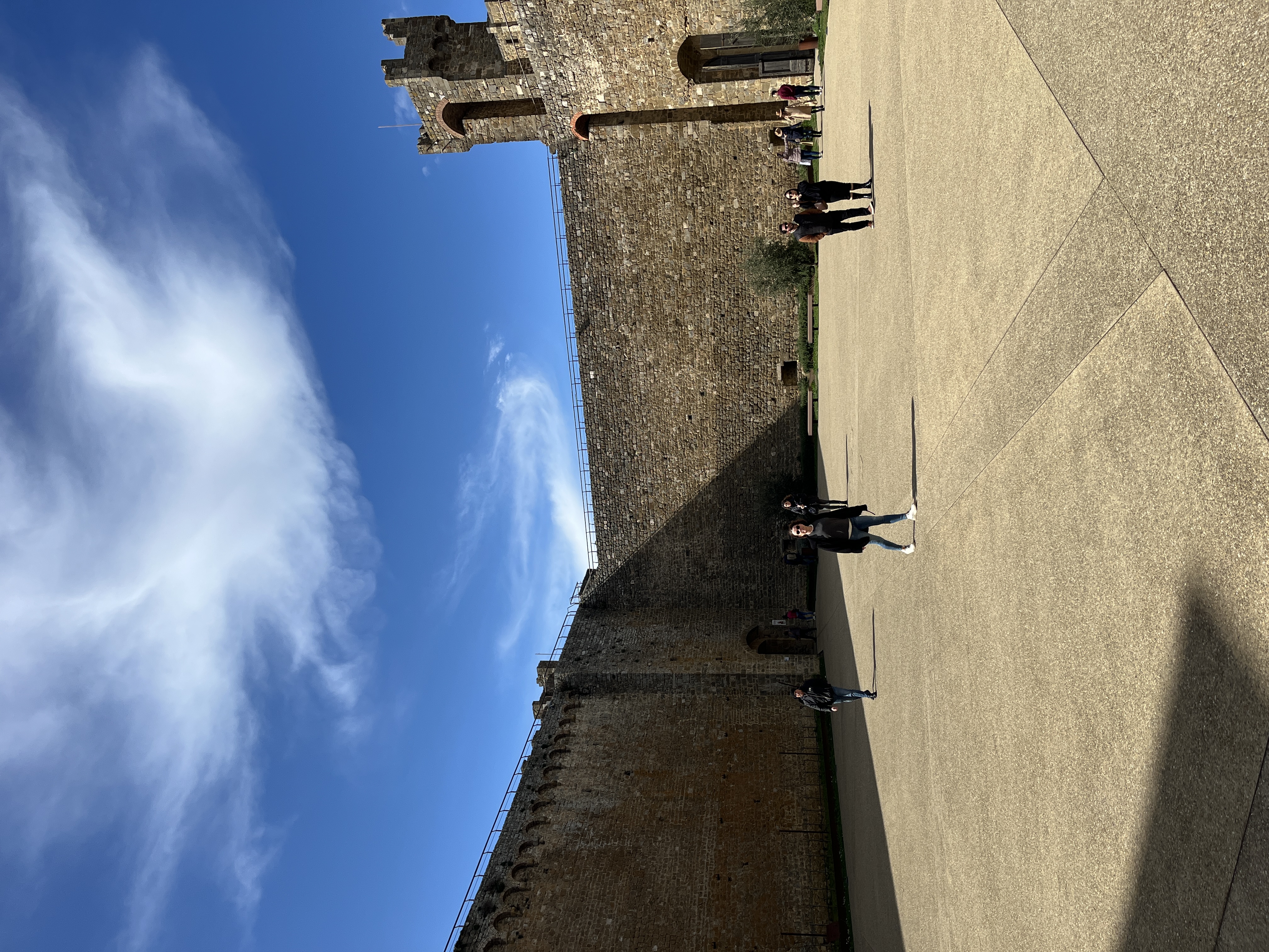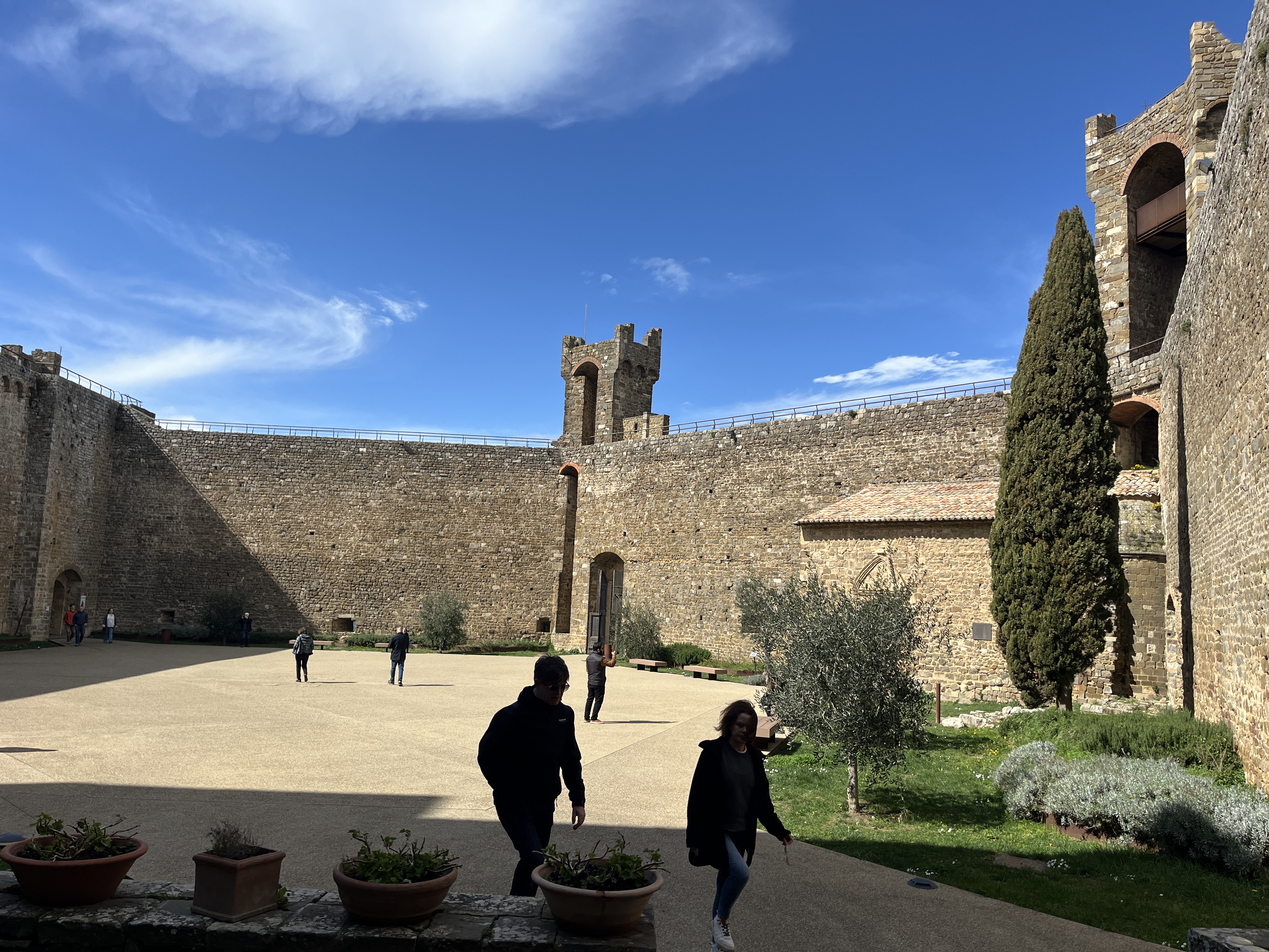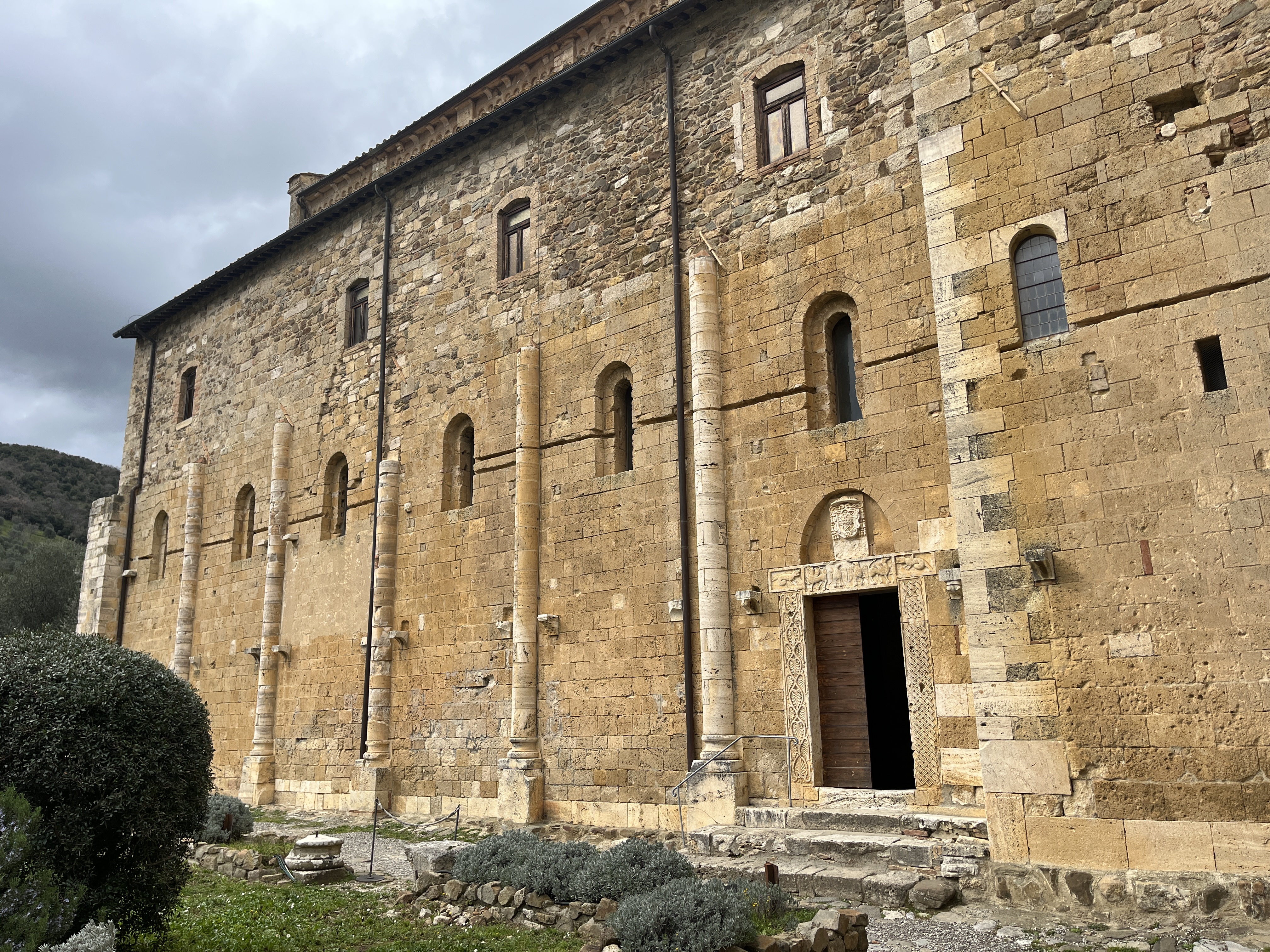 From Montalcino, we drove to Sant'Antimo, the church where Zeffirelli filmed the family church scenes. This was definitely the place. The sound of monks singing flooded into the church. For a while, we tried to locate them and realized that the music was being piped in. We did an audio tour and then filmed briefly, though we were hampered by people around. A monastery shop had honey, bottles of oil, and monastery-branded goods. Four nuns live there now, one of whom we spotted in the monastery garden. The structure was beautiful, with both Celtic and Roman elements. Like so many important buildings, it's constructed on top of other structures. We lingered in that peaceful place, letting the music wash over us, before driving back toward Rome.