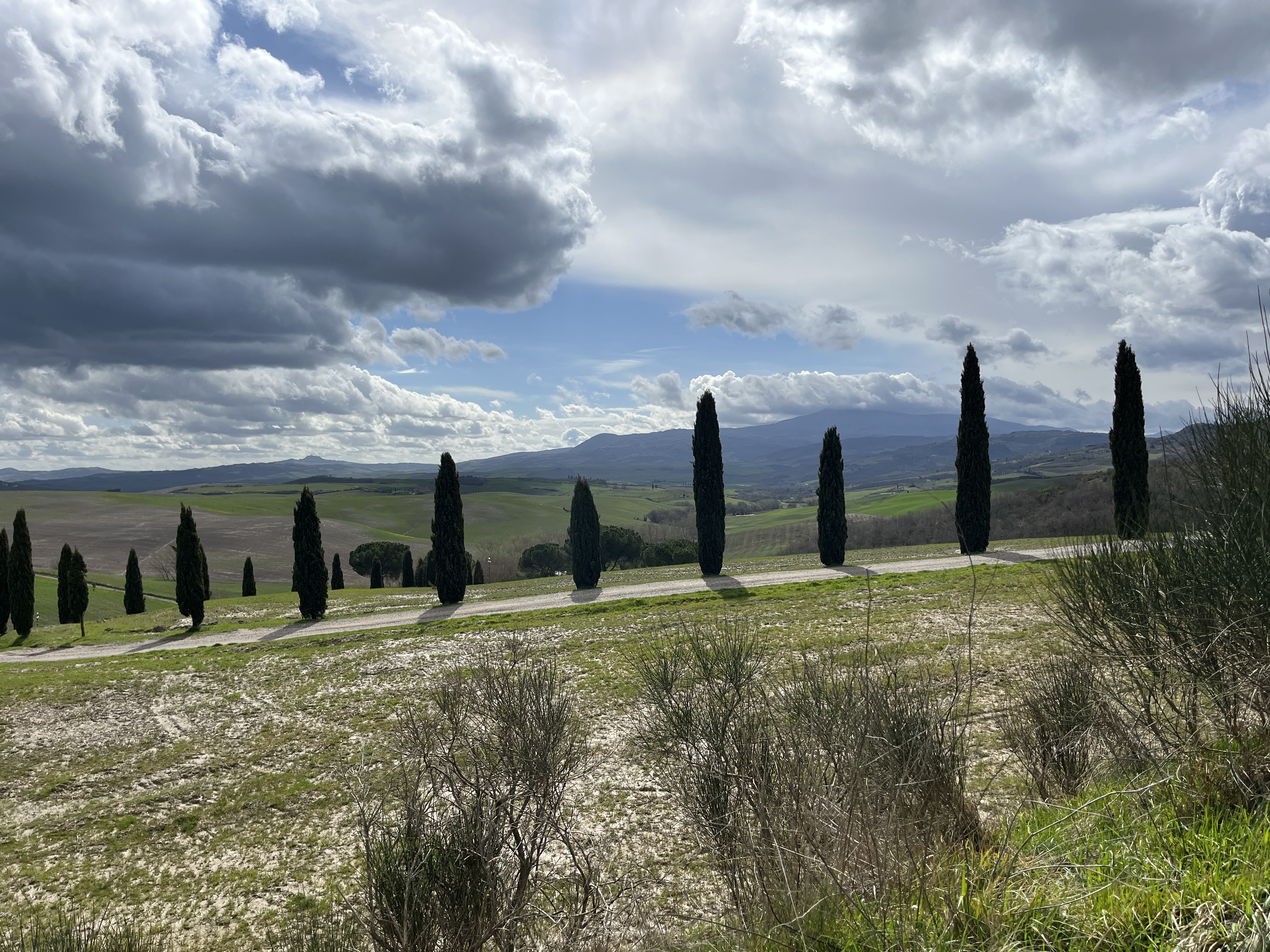 Next was Val d'Orcia in Tuscany, where we stopped in a field lined with Cypress trees to film meadow scenes. The earth was prickly, green, spongy and extremely high in clay. As I tried to run gracefully down a hill, like Clare coming to give her life to God, my slip-ons got sucked into the earth, and I stumbled. Alex did only marginally better as Francis, running toward me with his coat tucked over his shoulder. Our reunion, though, was close to perfect.