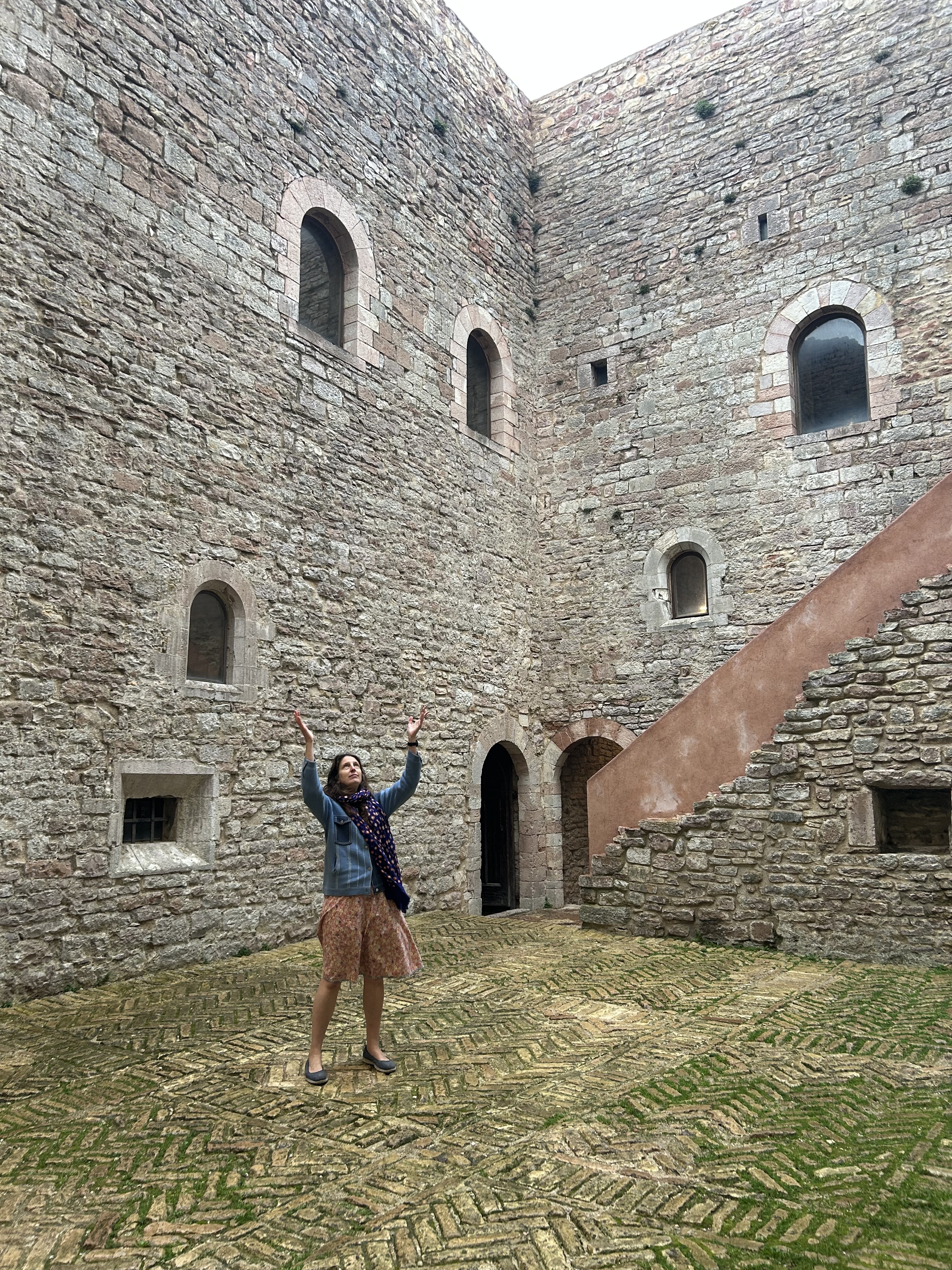 In Assisi proper, we visited the Cathedral (Frances' real family church, though not the one in the film) with its blue ceiling, and the Basilica of Saint Francis. On a whim, we stopped at Rocca Maggiore, a fortress overlooking the valley. Though this wasn't mentioned in any of our sources, it definitely had the vibe. There was almost no one there, and we filmed "flowers in the meadow", "throw it all away", the courtyard prayer scene and the "bird" scene almost without being apprehended. Later, in a furtive web search, I found that the wikipedia entry for Rocca Maggiore (but no other sources) mentions that movie scenes were shot here. We're quite certain about the courtyard scene, at a minimum.