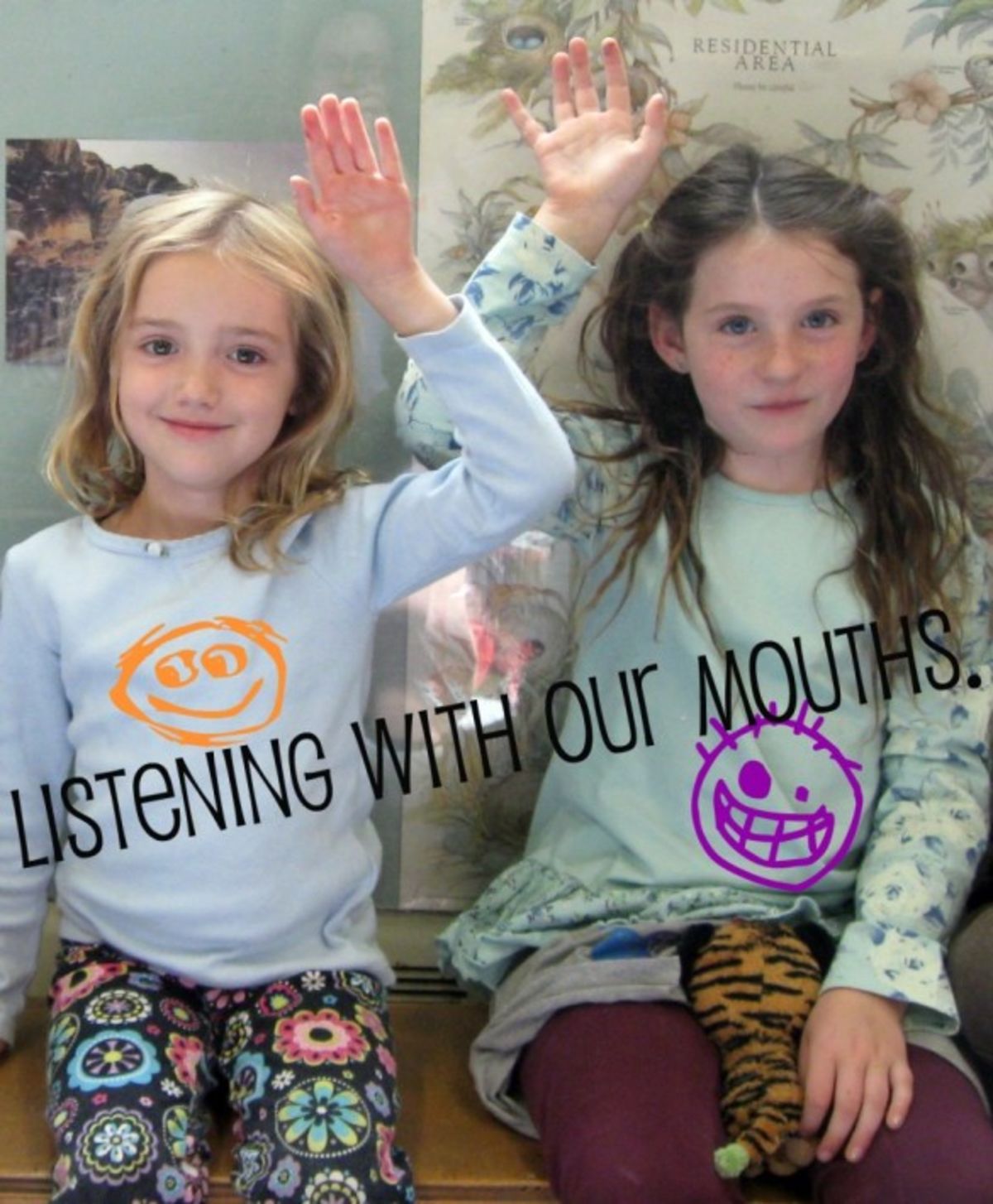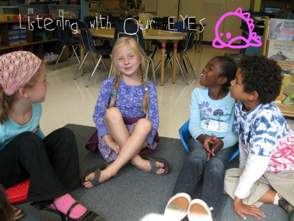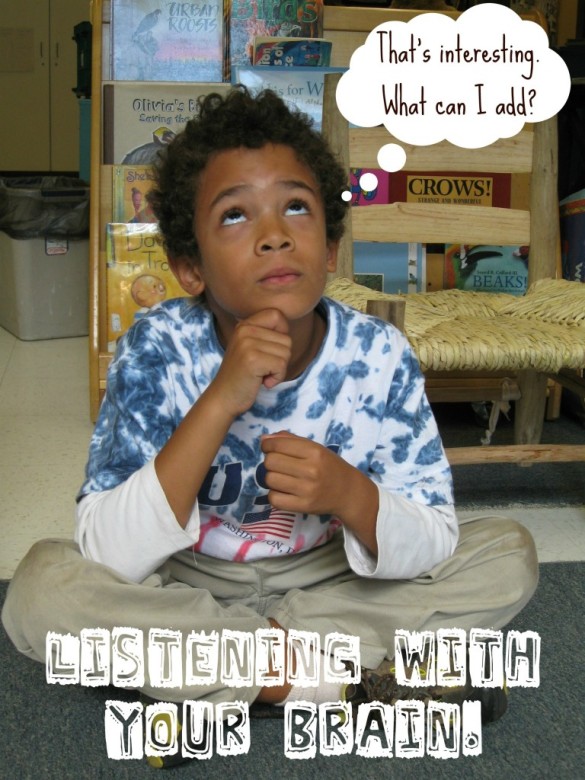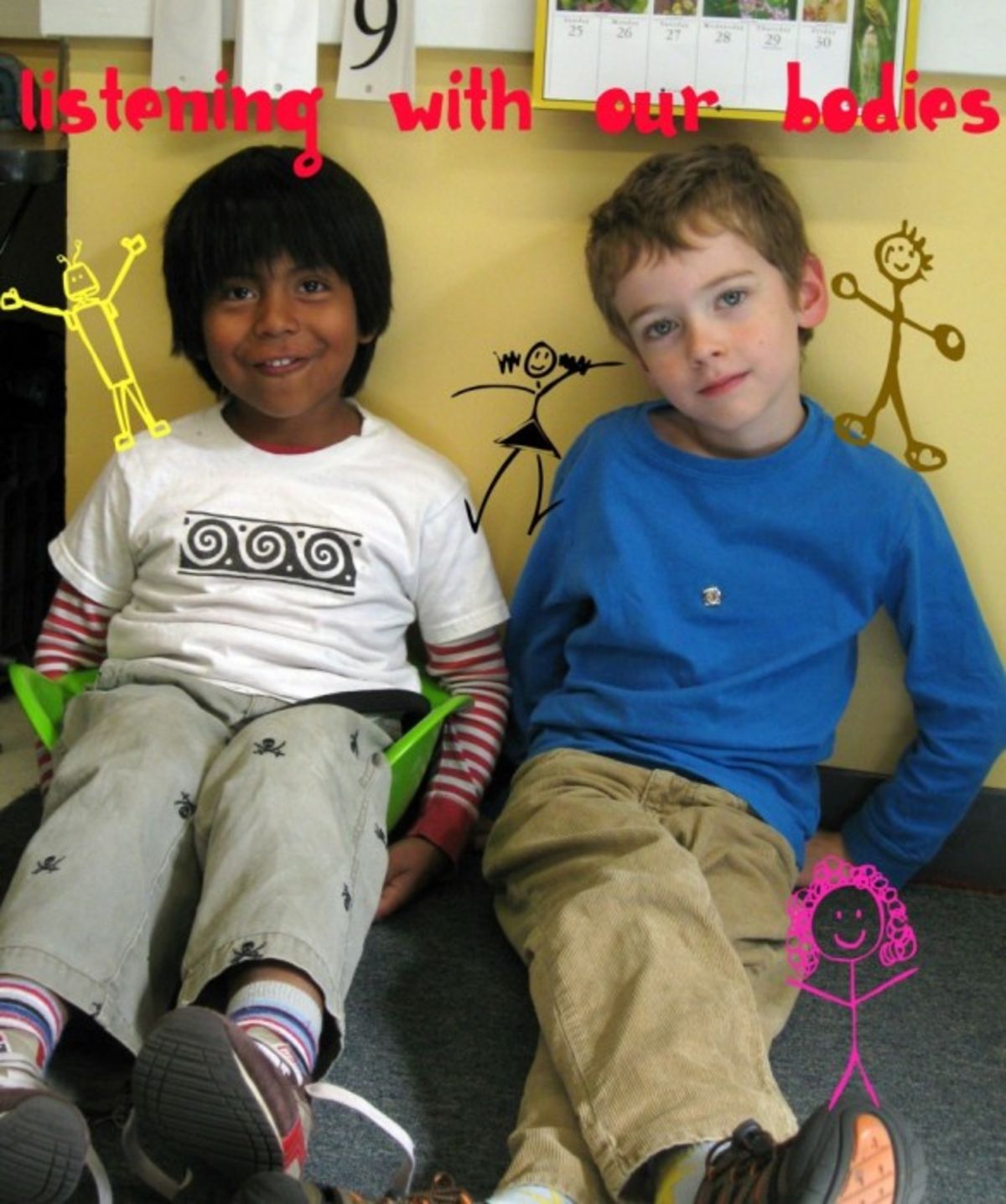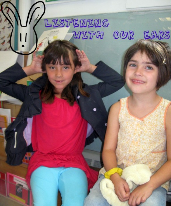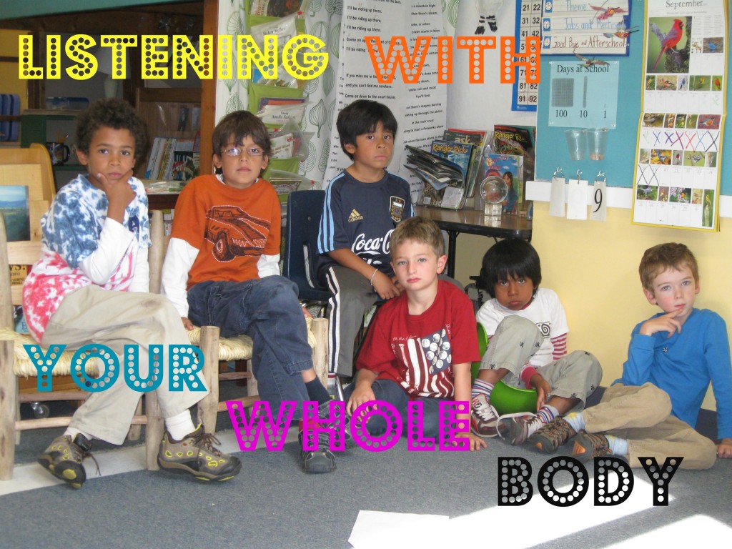My son’s 1st/2nd grade class did a segment on listening this last week (this was a first for this classroom). The kids discussed what’s involved in listening and apparently concluded that it’s a “whole body” experience. They created a series of photos to illustrate this point. You might notice Mohan in the second-to-last and last photos.