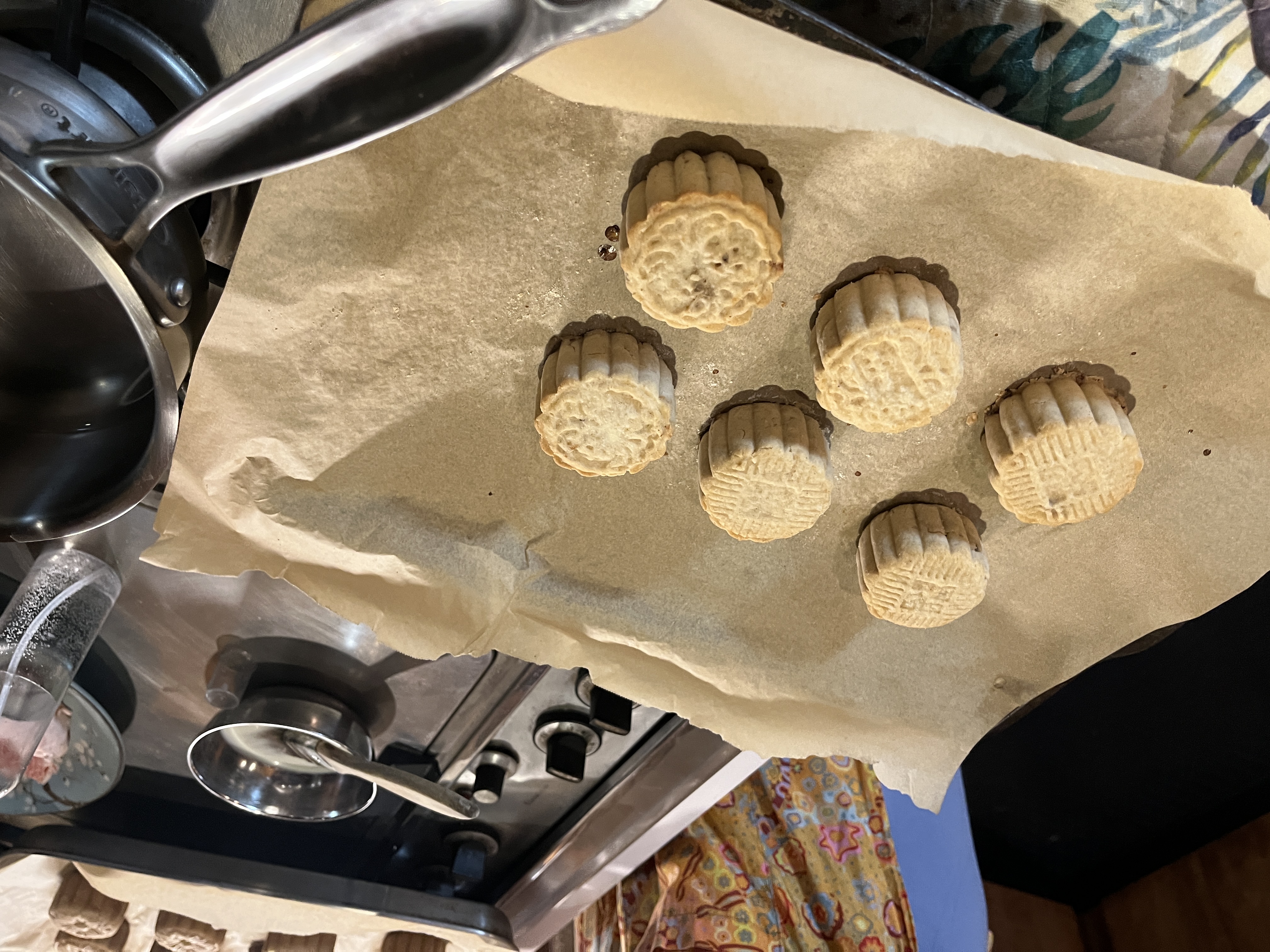 Bake at 375 F for 5 minutes, then brush each moon cake with egg wash, milk, or oil. Bake for another 10 minutes until golden.